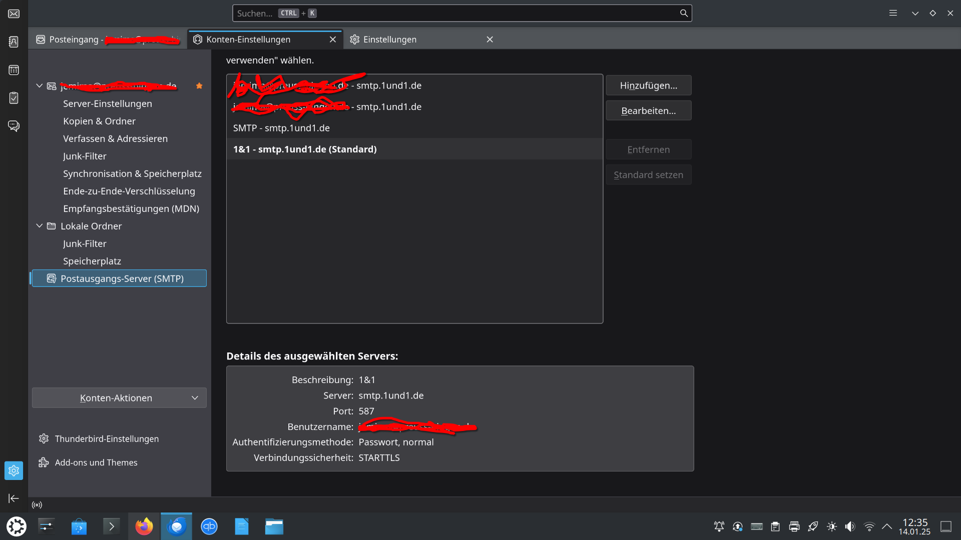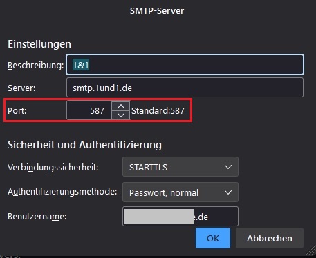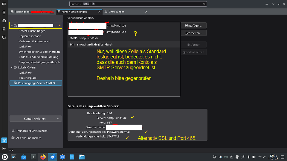 Ich habe eine private Domaine (@p***-bingen.de) eingerichtet, auf die ich über den 1&1-Webmailer zugreifen kann. Auf meinem neu eingerichteten Linux-System konnte ich die Domaine nun auf Thunderbird anmelden. Posteingang (Empfang der Mails) über IMAP klappt super, aber beim Versenden der Mails kommt: