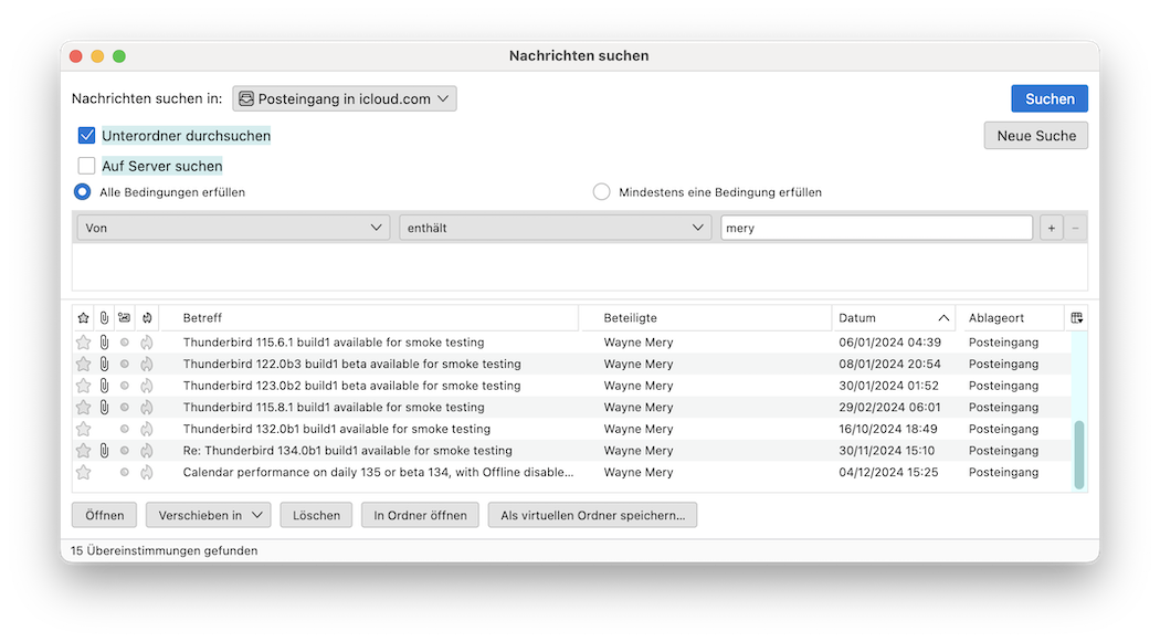 Gestern hatte ich die neuesten Mails im Abgleich mit dem Mailserver im Posteingang mit Worten aus dem Betreff suchen lassen und sie wurden in einem neuen Fenster angezeigt. Im Posteingang waren Sie dann trotzdem nicht sichtbar, sie lassen sich vom neuen Fenster aus auch nicht in einen anderen Ordner verschieben bzw. kopieren. Der Ablageort Posteingang wird aber angezeigt.