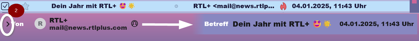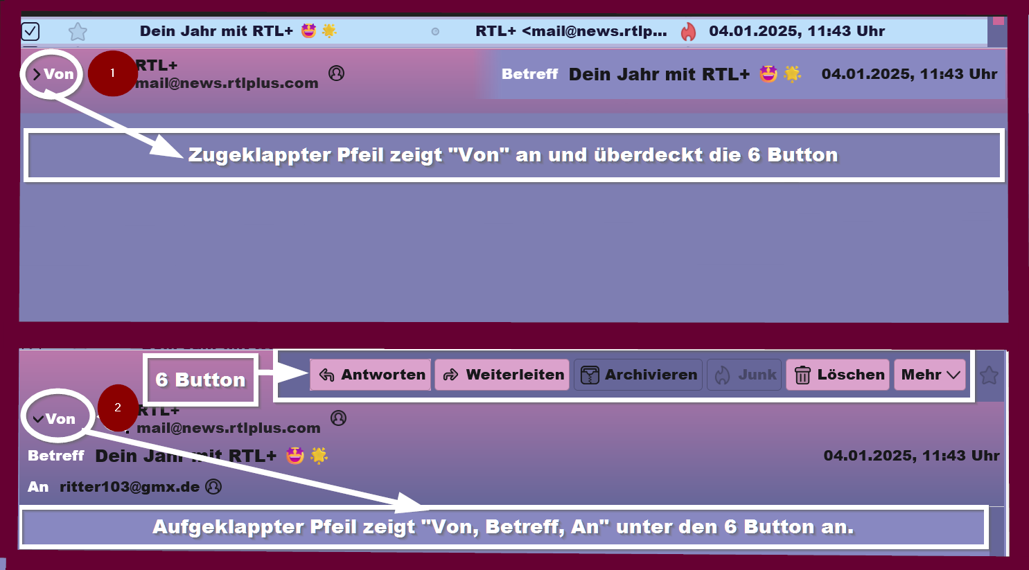 Denn durch das Aufklappen des Pfeils (mit den 3 Zeilen) beginnt ja direkt eine Zeile unterhalb dieser 6 Buttons mit "Von, An, Betreff".