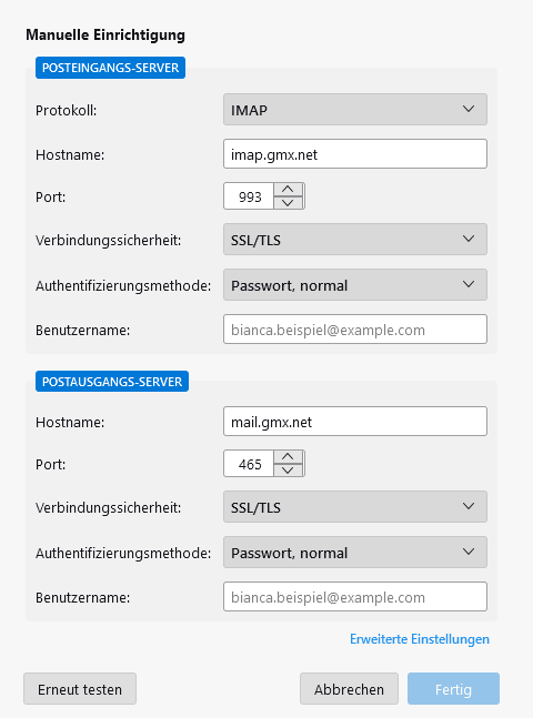Ich verzweifele seit 3 Stunden daran, ein neues E-Mail Konto mit meinem Mozilla Thunderbird (128.6.0esr (32-Bit)) Postfach zu verknüpfen. Ich habe dort standardmäßig ein gmx E-Mail-Konto hinterlegt. Nun würde ich gerne ein weiteres gmx E-Mail-Konto hinzufügen, allerdings hilft mir die Fehlermeldung nicht weiter und ich habe mich bereits zu Tode gegoogelt. Die Ports für Eingang- und Ausgangsserver scheinen auch die richtigen zu sein. Außerdem stimmen auch die E-Mail-Adresse und das Passwort, denn bei gmx selbst kann ich mich ohne Probleme einloggen. Ich würde außerdem das IMAP Protokoll bevorzugen.