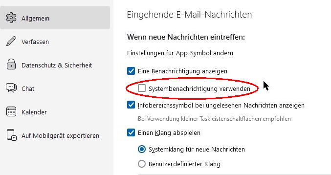 Nachtrag: Unter (Extras) - Einstellungen - Allgemein kann die Systembenachrichtigung in Thunderbird abgestellt werden.
