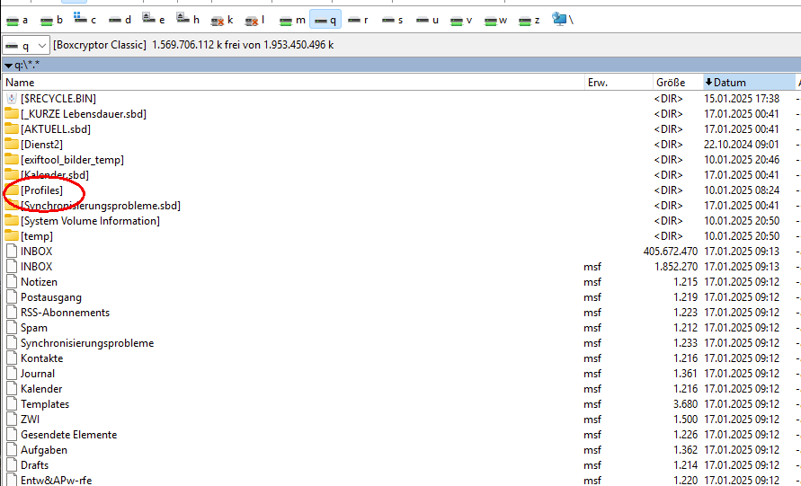 - Nachdem ich TB mit beiden Profilen betrieben habe, legt TB NEBEN den Profilordnern eine ganze Reihe Datein an- offenkundig aus EINEM der beiden Profile. Dateien wie INBOX, INBOX.msf, junk.msf, gesendet.msf, auch solche, die Unterordnern entsprechen -- dazu Unterordner wie [AKTUELL.sbd], [KALENDER.sbd] und [syachronisierungsprobleme.sbd]
