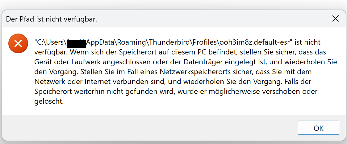 Heute wollte ich mir lokale Ordner zum speichern anlegen und sehen ob die Standard Ordner dafür "geeignet" sind. Im Datei Explorer konnte ich aber in den üblichen Ordnern für die Profile unter \user\xxxxxx\appdata\xxxxx keine TB Ordner in den Unterordnern local oder roaming finden. Deshalb schaute ich unter der "Informationen zur Fehlerbehebung" nach. Dort bekam ich nach click auf "Ordner öffnen" nur eine Fehlermeldung (Bild) oder nichts tat sich. Habe nichts manuell ein oder umgestellt.