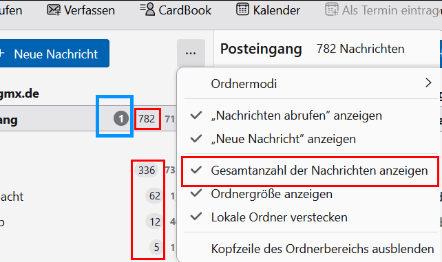 Ich habe mal ein Bildchen für dich gebastelt, welches einerseits die Stelle zeigt, wo du die Anzahl der Nachrichten im Ordner einblenden kannst (rechte rote Markierung), zweitens die tatsächlich sichtbaren Zalen der Mails in den Ordnern (linke rote Markierungen) und nochmal separat in blau die Anzahl der ungelesenen Mails: