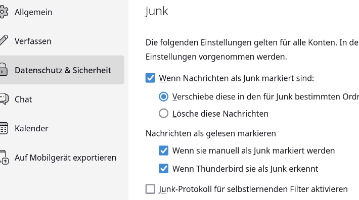 Allerdings ... nach dem Klick auf "Update auf 116.0" vorhin war nach wie vor 115.10.1 installiert und es wurde 115.18.0 angeboten – was nun auch installiert ist – aber genauso nicht funzt. Manuelle Junk-Deklaration setzt nach wie vor auch automatisch auf "gelesen", auch wenn der Haken nicht gesetzt ist ... grrr ...
