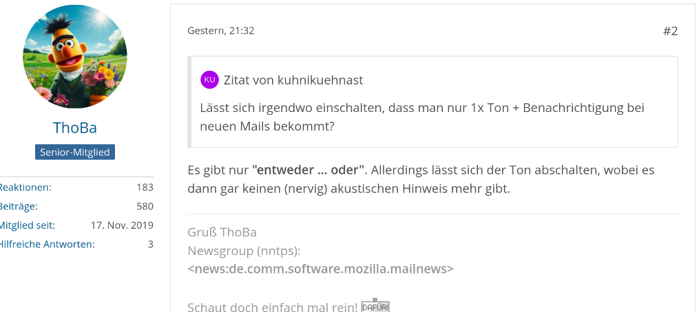 ich habe eine Frage: Lässt sich irgendwo einschalten, dass man nur 1x Ton + Benachrichtigung bei neuen Mails bekommt? Wenn ich meinen PC hochfahre und Thunderbird starte und entsprechend z.B. 20 Mails habe bekomme ich 20 x hintereinander das Popup mit der neuen Mail und den Sound dafür... Teilweise etwas störend.