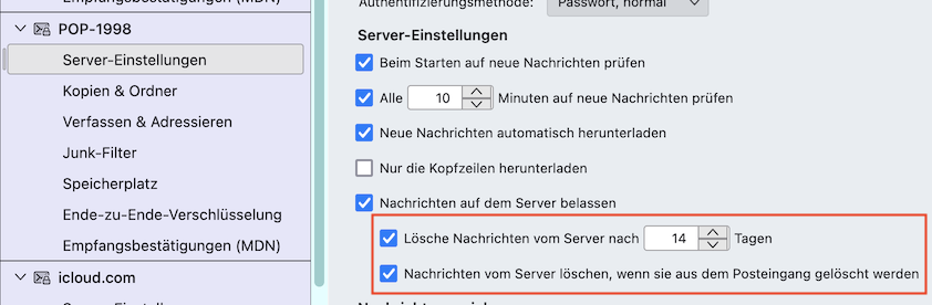 Das sind wie angezeigt die Standard-Server-Einstellungen nach dem Einrichten eines POP Kontos. Demnach werden die Nachrichten zwar auf dem Server belassen, aber nur 14 Tage lang oder bis sie aus dem Posteingang gelöscht werden.