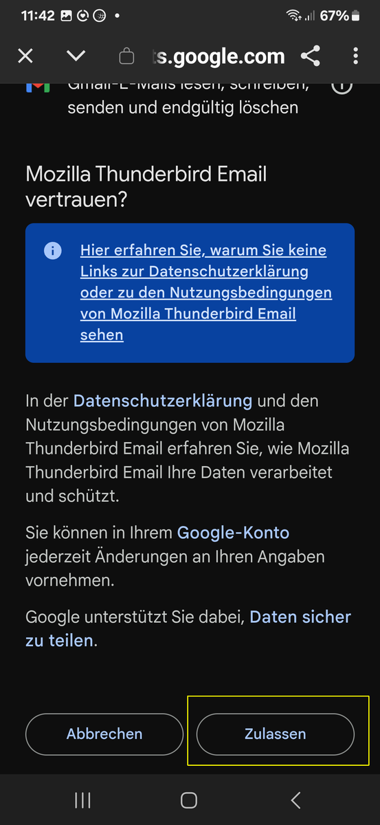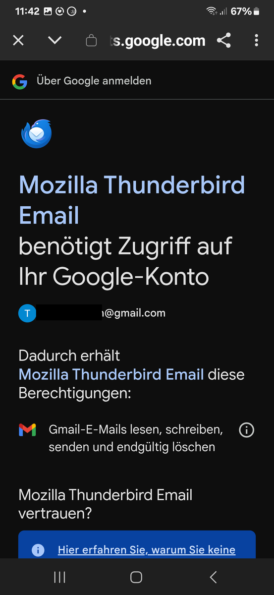 Dann hab ich die Einstellungen des Posteingangs und Postausgangsservers auf dem PC mit denen in TB android verglichen. Diese sind identisch. Die des Posteingangsservers unterscheiden sich aber zu den von Dir gezeigten Einstellungen. Du verwendest imap, ich aber pop. Die Einstellungen des Aussgangsservers sind wieder identisch. Also hab ich mal versucht den Posteingangsserver mit den imap-Einstellungen zu nutzen (also imap und port 993 (anstatt pop mit port 995) Das brachte dann wieder die Aufforderung mich mit google anzumelden. Das brachte dann aber die Fehlermeldung aus dem letzten Bild.