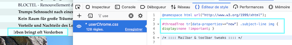 Oh, leider eine Verwechselung! meinerseits! Meine Zeile oben in der userChrome.css Datei heißt @namespace html url("http://www.w3.org/1999/xhtml");