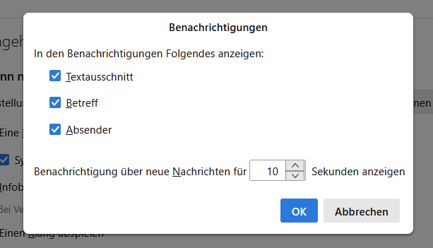 ich bekomme seit einigen Tagen regelmäßig nach dem Starten von Thunderbird eine Info (auf dem Bildschirm unten rechts) über eine eingegangene Mail "Privat" - siehe Screenshot.