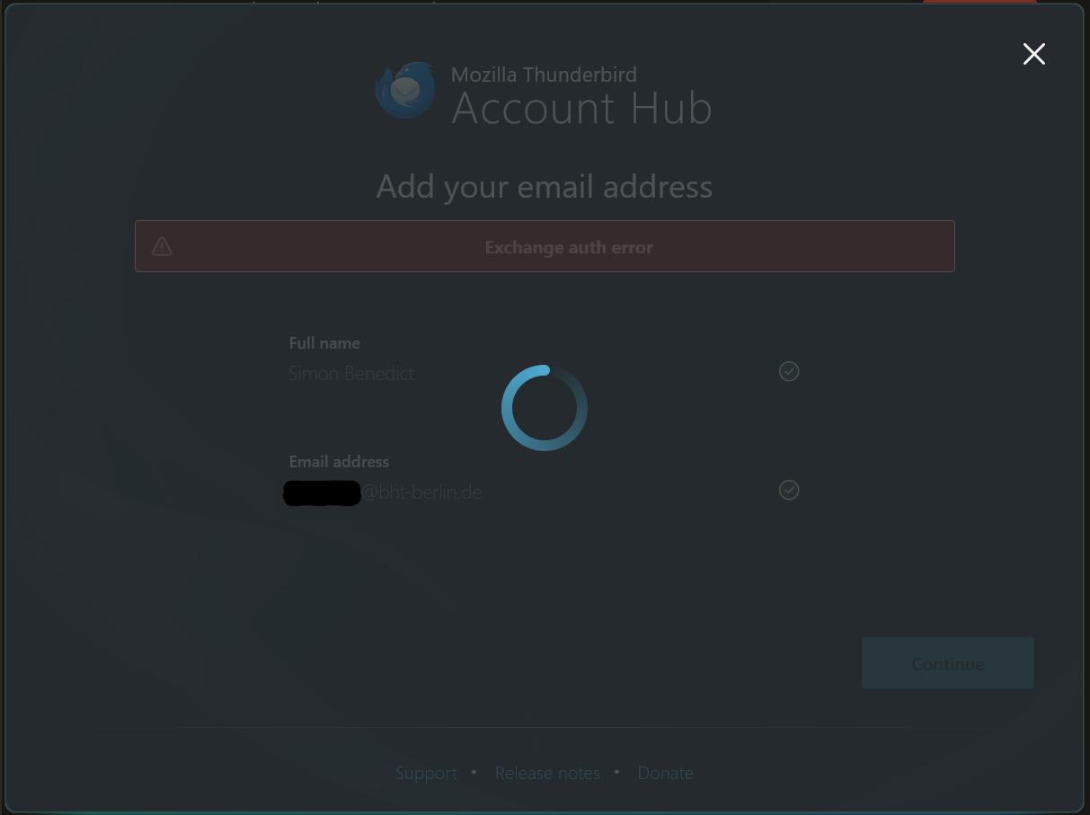 Das größte Problem ist, dass ich so nicht einmal zur manuellen Server-Konfiguration gelange. Das Pop-up, das erscheint, um die E-Mail-Adresse hinzuzufügen, hängt mit einem Ladesymbol, auch längeres Warten (~15 min) hilft nicht (siehe Screenshot).