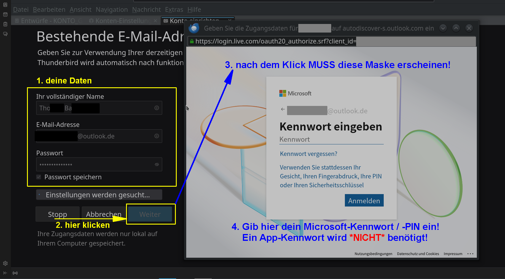 Du musst in deinem MS-Account für den TB ein App-Kennwort generieren und dieses dann als Passwort im TB verwenden.