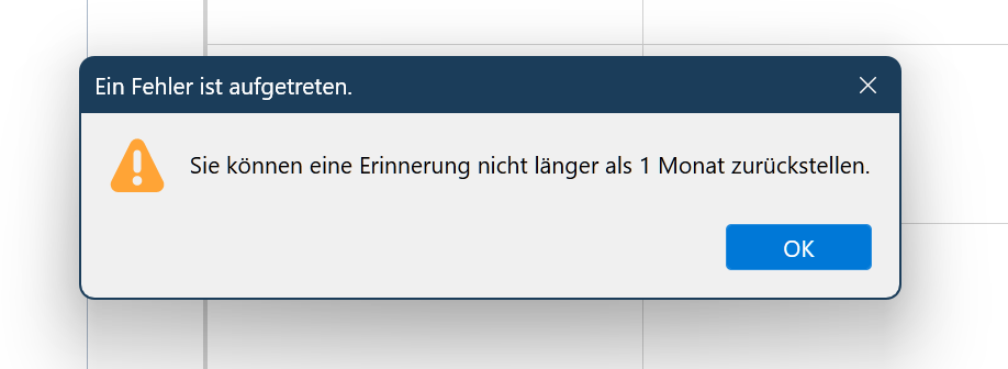 deshalb sollte man beachten, falls man heute(29.03.2025) einen Termin erstellt z.b. 1 Juni 2025 und die Erinnerung z.b. auf 60 Tage bevor der Termin beginnt auswählt , es zu keiner Fehlermeldung kommt, sondern die Tage mehr als 31 akzeptiert werden !!! , allerdings die Erinnerung erst bei / ab dem 31 Tag/en erscheint….also nicht Anfang April (60 Tage), sondern erst Ende April (31 Tage) It's not a bug it's a feature...