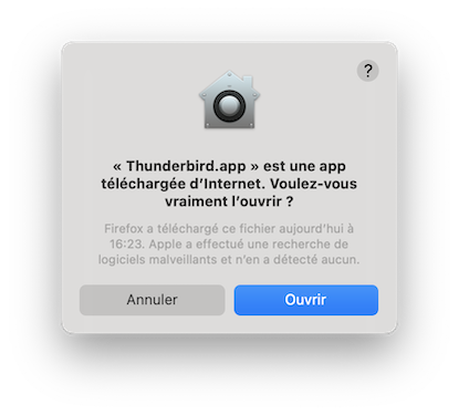 Nein, ich habe es exakt so gemacht, wie Du es oben beschrieben hast. Thunderbird lässt sich von der offiziellen Websiite problemlos herunterladen, entpacken ,in den Ordner verschieben. Ich habe dann anschließend eine Verknüpfung unten im Dock auf Thunderbird gemacht. Wenn ich zum ersten Mal Thunderbird starten will erscheint auch das Fenster "Thunderbird.app" und habe auf den Blauen Button zum Öffnen geklickt.