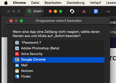 Auch dort wird überwiegend in englisch kommuniziert."Sofort beenden"- Fenster is the Window, when I click on the Apple Logo on the top left bar.