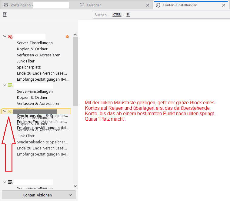 Warum auch immer, bei mir geht es nicht. Weder mit links noch mit rechts Klick. Ich kann es gar nicht "halten". Wenn ich die Maus nach oben ziehe, wandert die Hinterlegung mit (also alles auf dem Weg ist dann hinterlegt) aber nicht das Konto. Kann doch nicht sein, dass mein Windows/Rechner/Thunderbird ganz anders ist!?!? 🤔