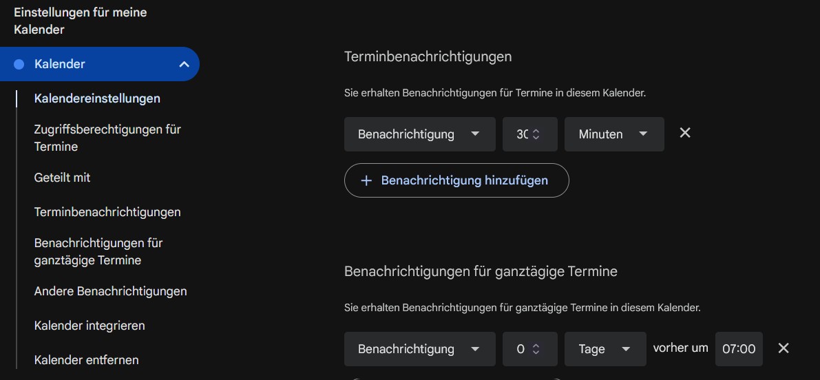 In Google stehen die Benachrichtigungen auf AUS. Und auch der Versuch, einen Kalender zu löschen und neu zu laden, um etwa fehlerhaften Cache in Google zu löschen, schlug fehl. Es bleibt rätselhaft. Danke für die Hilfe.
