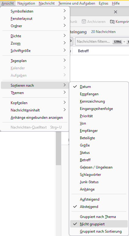 Wenn ich es gerade richtig gesehen habe, dann ist bei Dir außerdem die 'Gruppierte Ansicht' aktiviert. Das kann die Anzeige, Reihenfolge und Gliederung gehörig durcheinander bringen, weil alles als Konversation interpretiert wird. Allerdings öffnen die Bilder aus Deinem Beitrag gerade nicht.