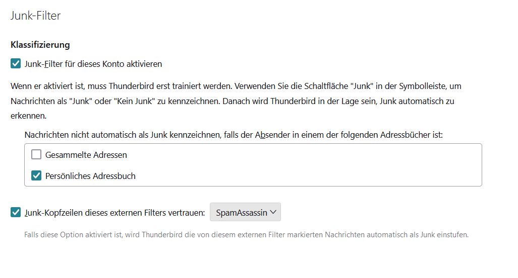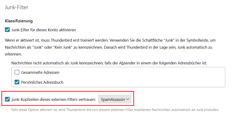 Mit der rot umrandeten Einstellung in Thunderbird kann es jedoch zu so einem Ping-Pong kommen, da Thunderbird dann immer wieder auf die extern eingetragene Spam-Wertung schaut und diese übernimmt.