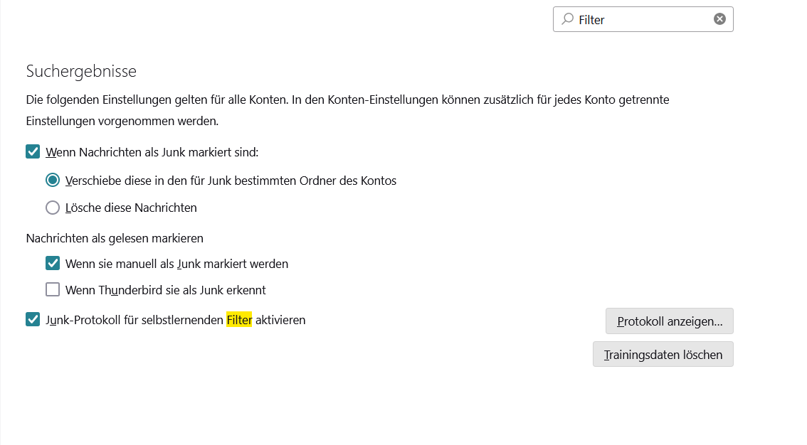 dErzOnk , interessant. So einen Eintrag 'Ursprung der Junk-Bewertung' kenne ich bisher noch nicht. Allerdings gibt es eine solche Auswahlmöglichkeit in meinem Thunderbird zunächst auch nicht und die Aktivierung der besagten Option trägt sich da auch erst einmal nichts automatisch ein. Erst nach einem Neustart von Thunderbird findet sich tatsächlich solch ein Eintrag neu unter den Filtern.