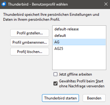 Ich habe mit dem Profilmanager bereits ein neues Profil "AG25" erstellt und den Ordner "E:\7n26crtm.default" ausgewählt. Leider ohne Erfolg.