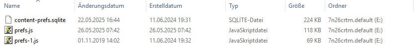 (xxx steht hier für eine aufsteigende Nummerierung, die zu sehende prefs-1.js vom November 2019 mit 69 kB Größe wird ja kaum die letzte gewesen sein.)