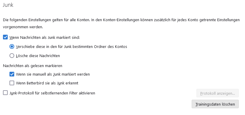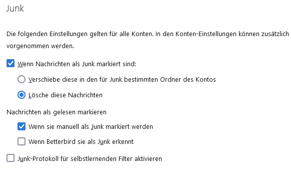 Da steht aber: Wenn Nachrichten als Junk markiert sind. Das betrifft doch in meinen Augen auch die Mails, die der Junk Filter selber als solche markiert. Das will ich nicht, weil da können ja auch gute dabei sein.
