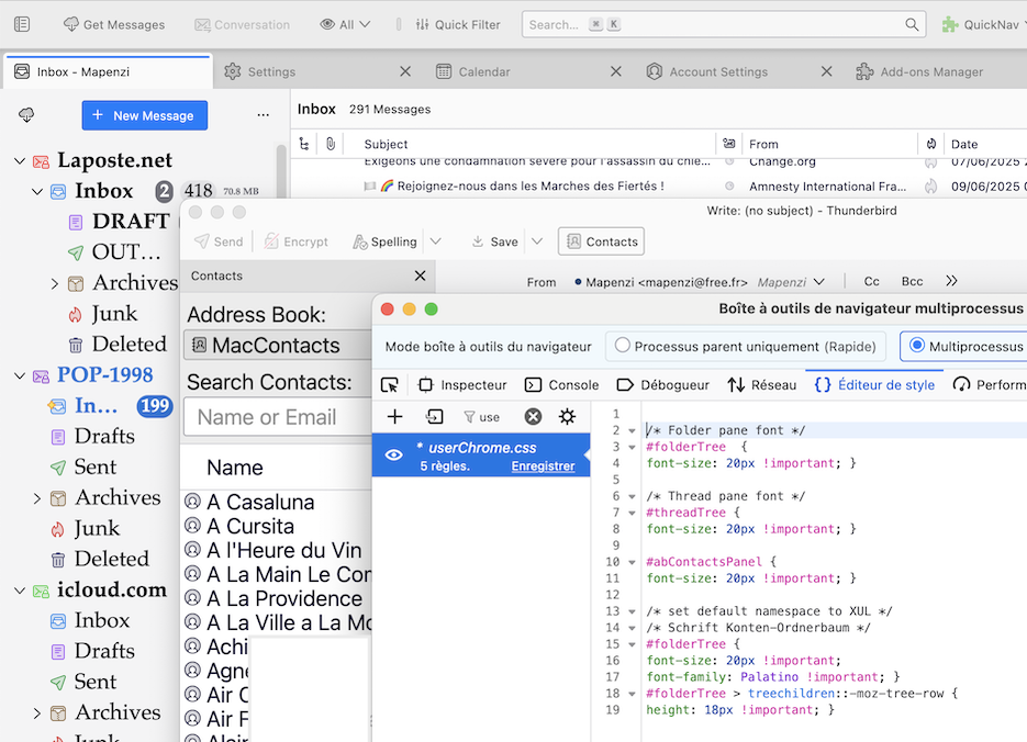 Das bedeutet, dass dein von mir bereinigter CSS Code für die Schriftgrößen in Konten/Ordner-Liste und Kontakte-Sidebar funktioniert, wobei der Code für Konten/Ordner-Liste gleich doppelt vorhanden ist, was hier aber nicht schadet.