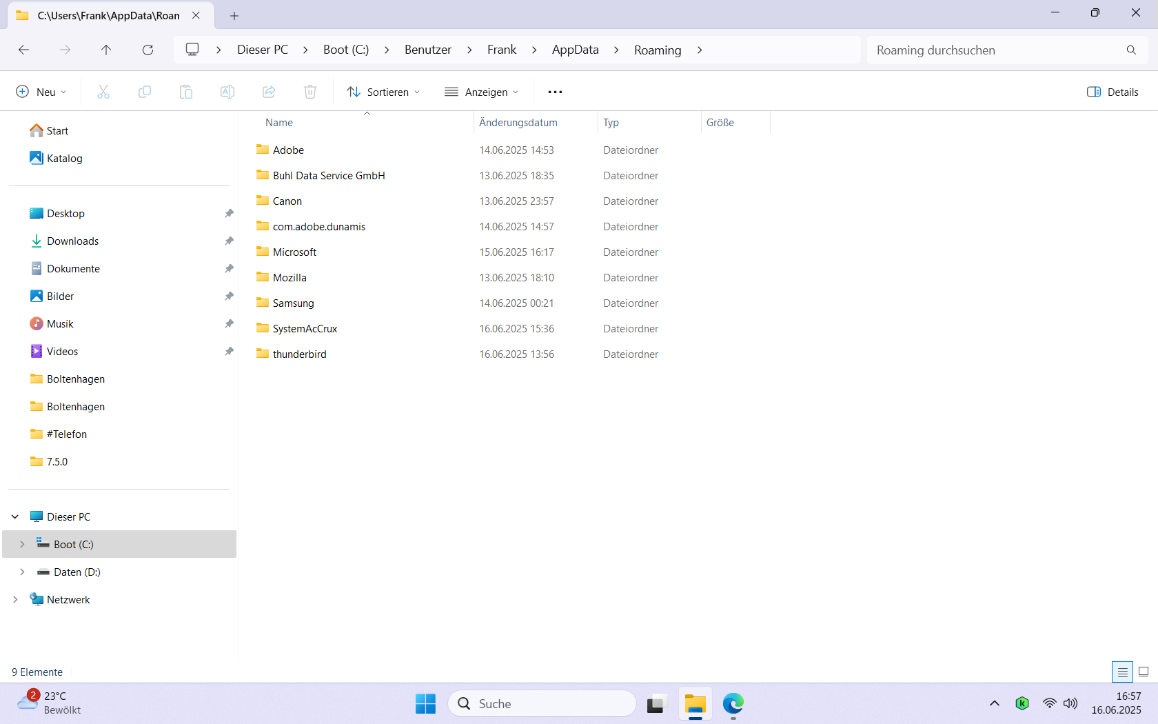 Aber die Richtung stimmt, das ist der Inhalt von %AppData%, du bist an der richtigen Stelle (nur auf dem falschen Compi ;))