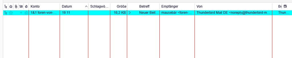 Ich bin nicht in der Lage mir wieder Begrenzungslinien oder abwechselnde Unterlegung der Mails im Hauptfenster anzulegen. Ich hab schon versucht über KI (Copilot) mir eine entsprechende .css Datei erstellen zu lassen, nichts funktioniert. Immerhin der Hinweis daß XUL (???) nicht mehr funktioniert und durch HTML ersetzt wurde... Ferner ist mir die Terminologie der .css total fremd.