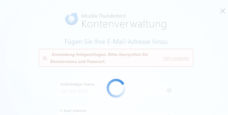 Ich versuche eine E-Mailadresse einzurichten und werde lediglich nach Benutzername und E-Mailadresse gefragt. Dann bekomme ich die Nachricht "...Bitte überprüfen Sie Benutzername und Passwort" und Thunderbird friert ein: