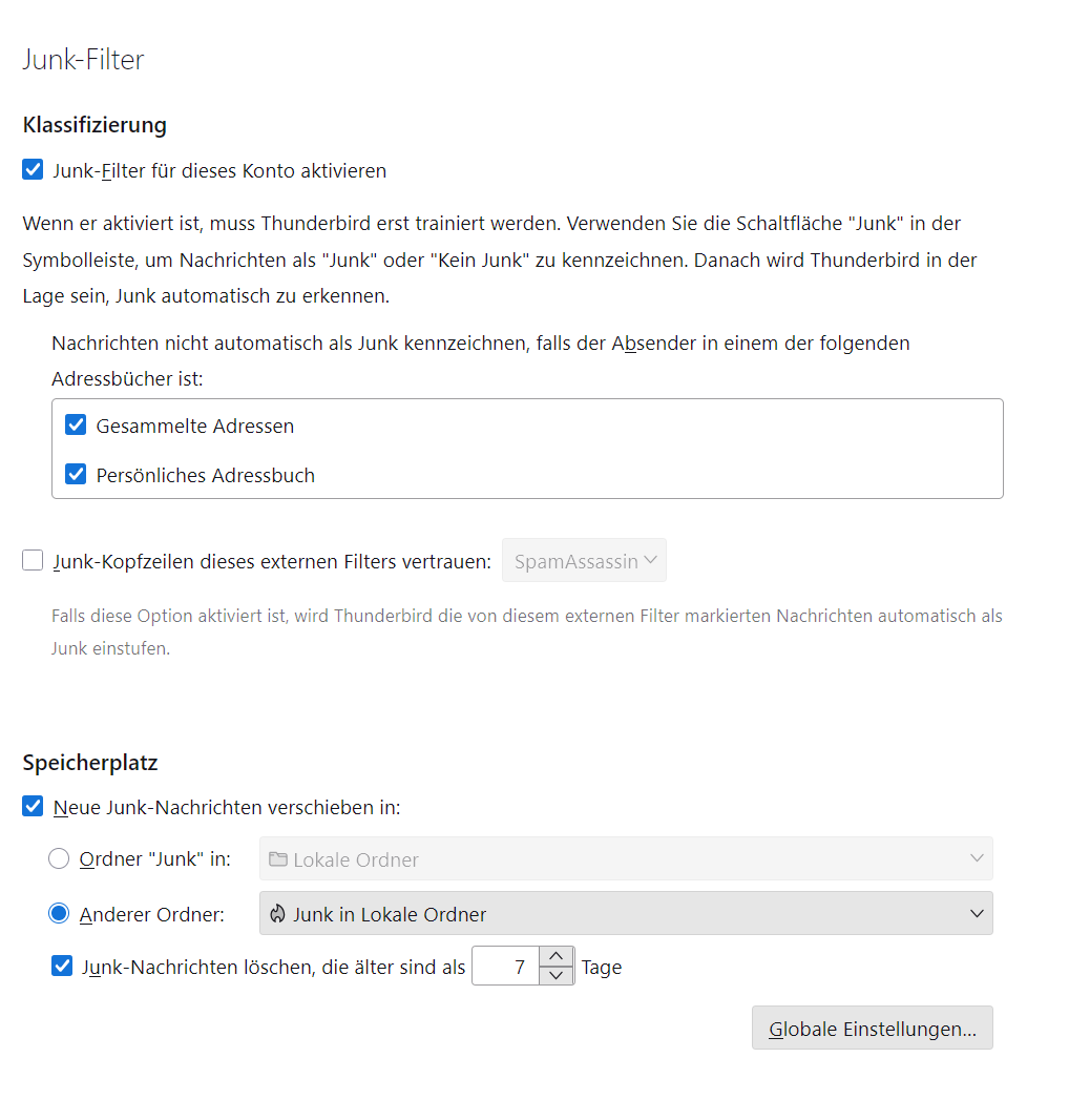 könnte mir jemand verraten wie man das einstellen muß das Spam/Junk emails direkt in den Lokalen Ordner in Junk verschoben werden und nicht direkt in das email kontoim Ordner Spam bleiben ?