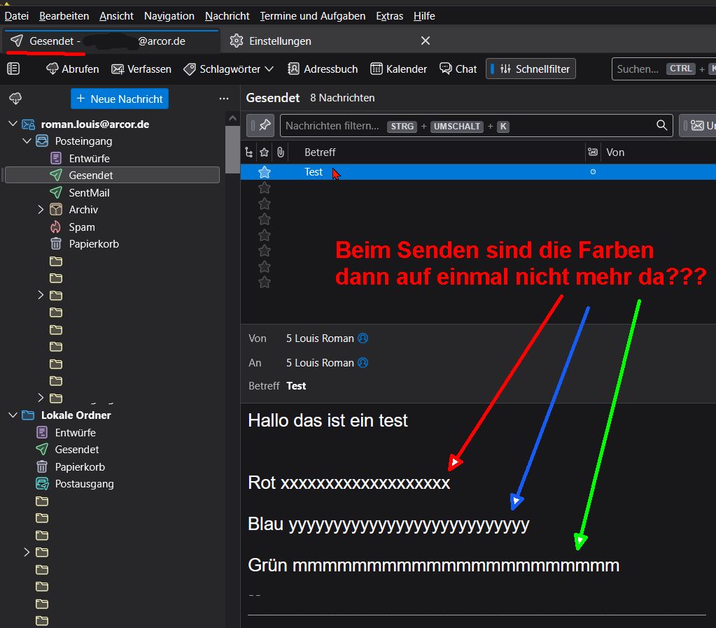 Wie schon oben gezeigt sind im Gesendet Ordner die Farben nicht zu sehen!
