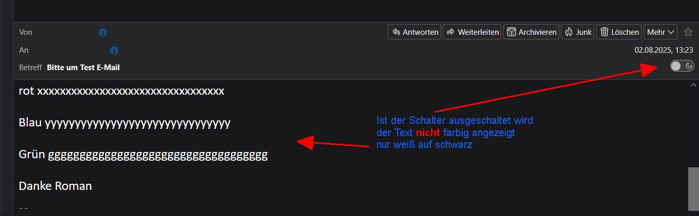 RomanL guckst Du mal in Einstellungen -> Allgemein -> Schriftarten und Farben unter dem Button "Farben" ob da bei "Systemfarben verwenden" und in Einstellungen -> Verfassen -> HTML-Optionen ob da bei "Standardfarben des Programms verwenden" Haken gesetzt sind. Wenn ja, die Haken mal rausnehmen. Gegebenenfalls Thunderbird danach neu starten.