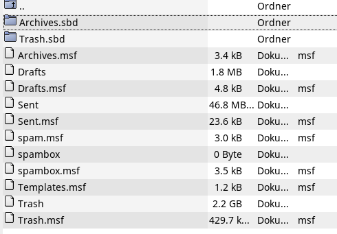 Noch mal zum Verständnis: es handelt sich um Dateien und nicht um Ordner und die sind nur bei den zwei am häufigsten benutzten Mailadressen so groß. Der Ordner Trash.sbd ist leer.