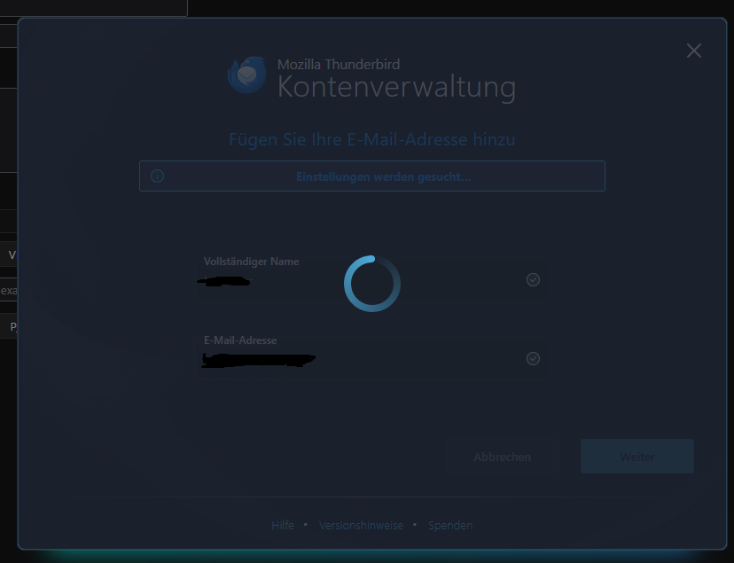 Beim hinzufügen einer Email Adresse, welche über IONOS registriert ist bleibt Thunderbird schon im ersten Dialog endlos hängen.