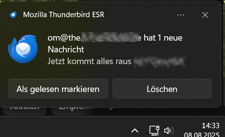 Seit der 140.0.* (weiss nicht mehr genau welche Minor) bekomme ich neue Mails mit der Windows-Benachrichtigung (Box unten rechts) angezeigt, kann "löschen" oder "gelesen" anklicken, aber TB selbst wird mit einem Klick woandershin nicht mehr geöffnet, um die Mail selbst zu lesen.