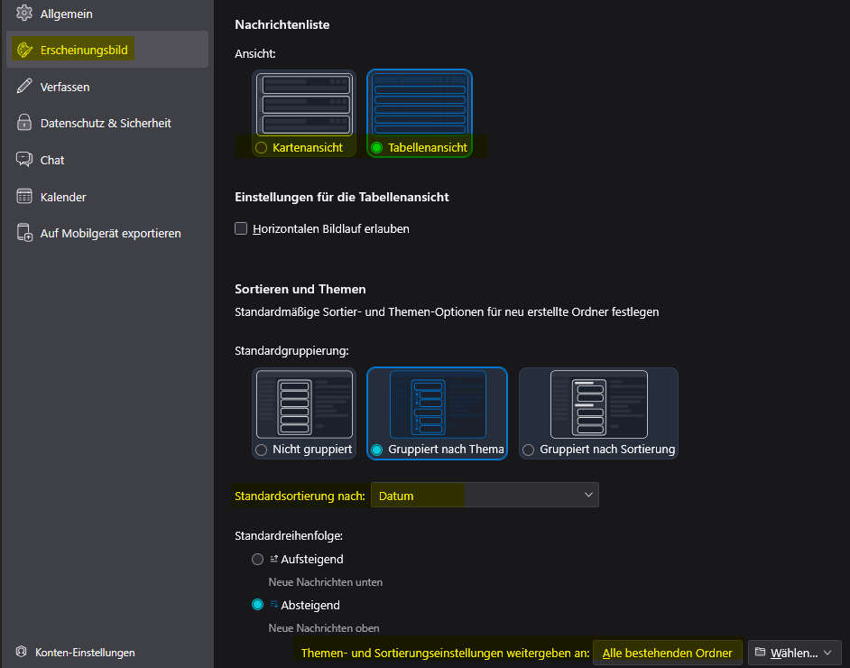 Wenn du "nach Datum sortieren" und/oder die "Kartenansicht" auswählst, dann bleibt die Sortierreihenfolge und/oder die Kartenansicht auch erhalten. Dieses sind globale Einstellungen (Erscheinungsbild) und gelten für alle Konten!Hier sieht man die globalen Einstellungen, welche für alle Konten gelten! Die Kartenansicht als auch die Sortierreihenfolge nach Datum wird hier global festgelegt (siehe gelbe Markierungen).