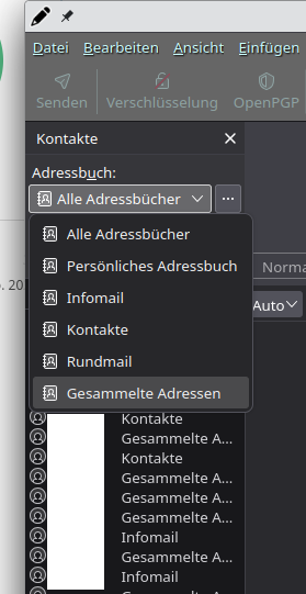 Der Grund ist, dass im "Verfassen"-Fenster im Adressbuch die "Gesammelte Adressen" nicht sichtbar und auch nicht zugreifbar sind. Auch in "Alle Adressbücher" werden die Adressen aus "Gesammelte Adressen" nicht gefunden. Es werden nur die im Screenshot angezeigten Adressbücher benutzt.