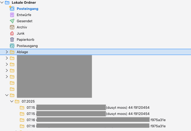 Die Konten sind als POP-Konten angelegt mit Ordnern und Unterordnern, i.d.R. 3 Ebenen.