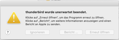 Zusätzlich bekomme ich seitdem jedesmal nach dem normalen Beenden von TB die Fehlermeldung: "thunderbird wurde unerwartet beendet".