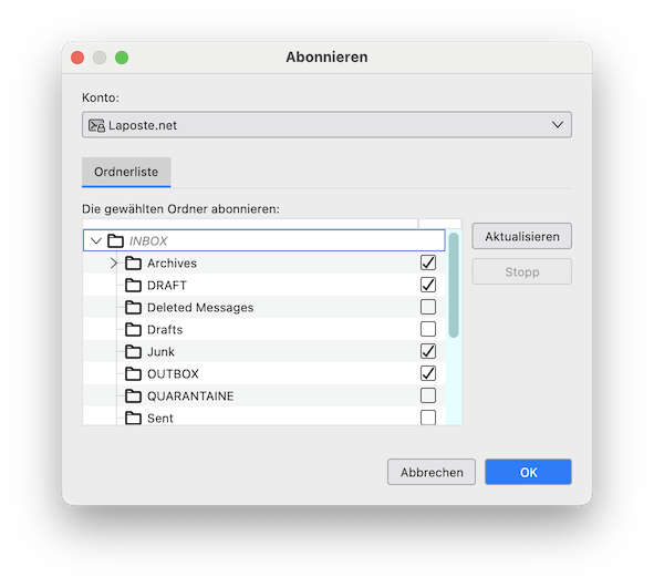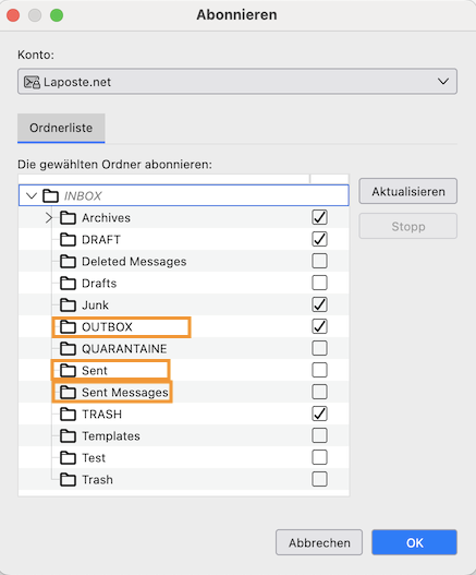 Klicke ich in der Aufstellung links auf den Kontonamen xxx.t-online.de und klicke dann mit der rechten Maustaste um zu "Abonieren" zu kommen, werden dort auch keine meiner Ordner mehr angezeigt.