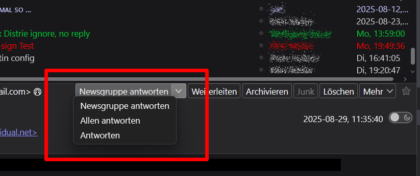 aber seit zwei oder drei Versionen funktioniert der "smart reply" Button nicht mehr in Newsgruppen.