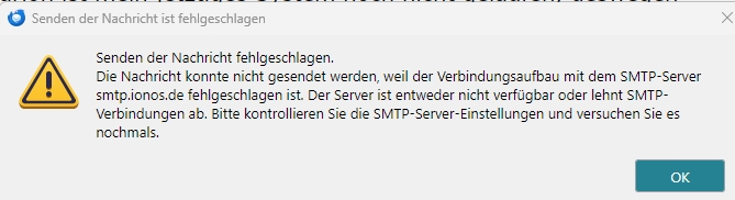 Die Nachricht konnte nicht gesendet werden, weil der Verbindungsaufbau mit dem SMTP-Server smtp.ionos.de fehlgeschlagen ist. Der Server ist entweder nicht verfügbar oder lehnt SMTP-Verbindungen ab. Bitte kontrollieren Sie die SMTP-Server-Einstellungen und versuchen Sie es nochmals."