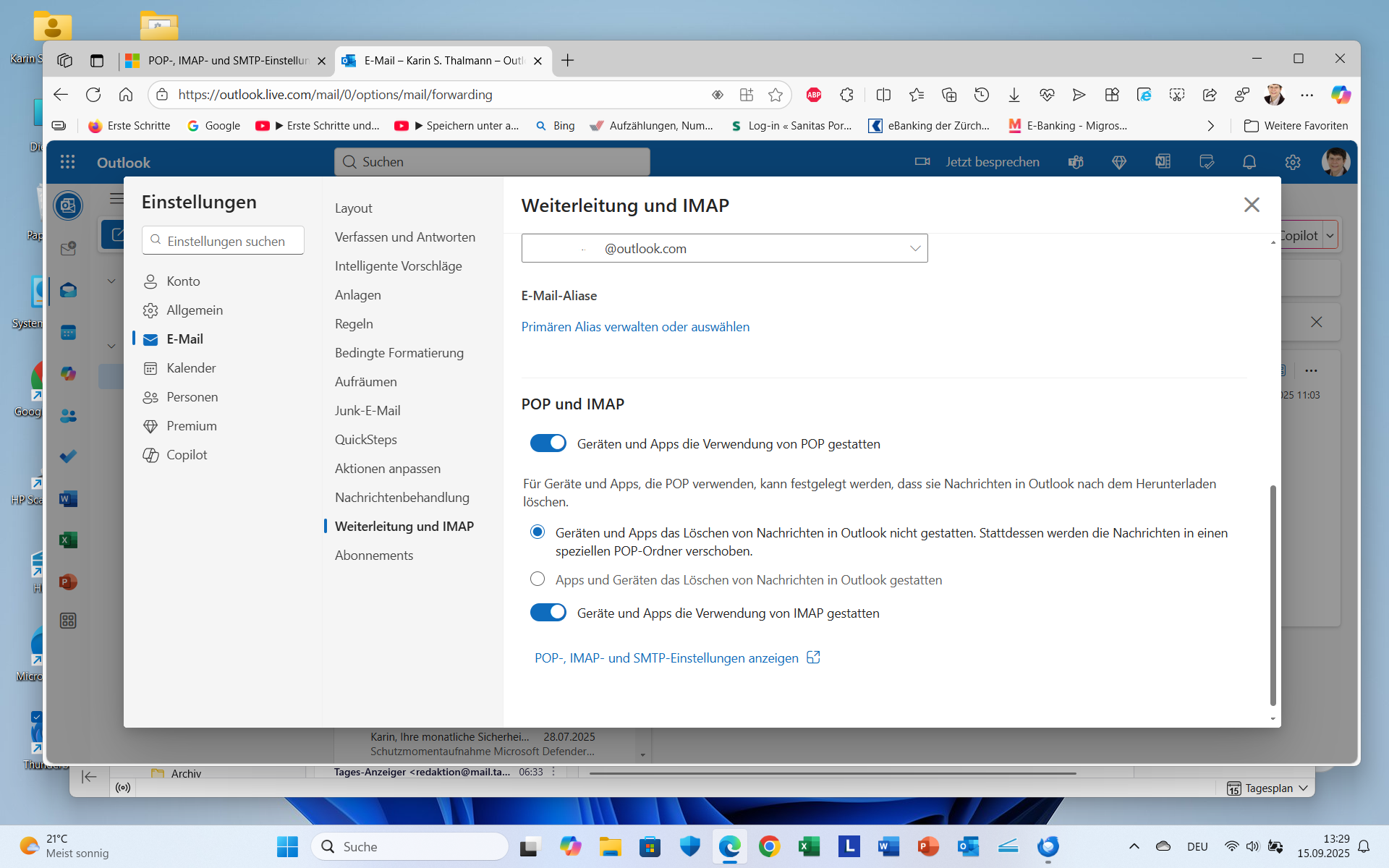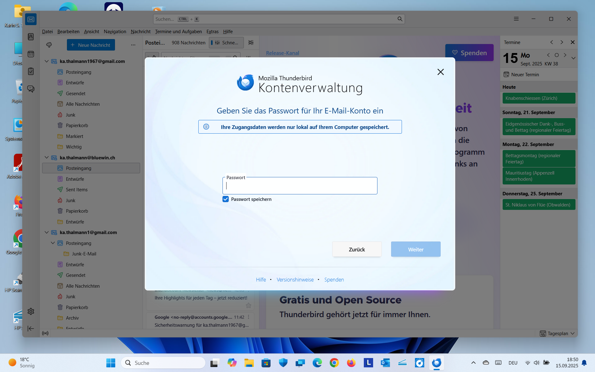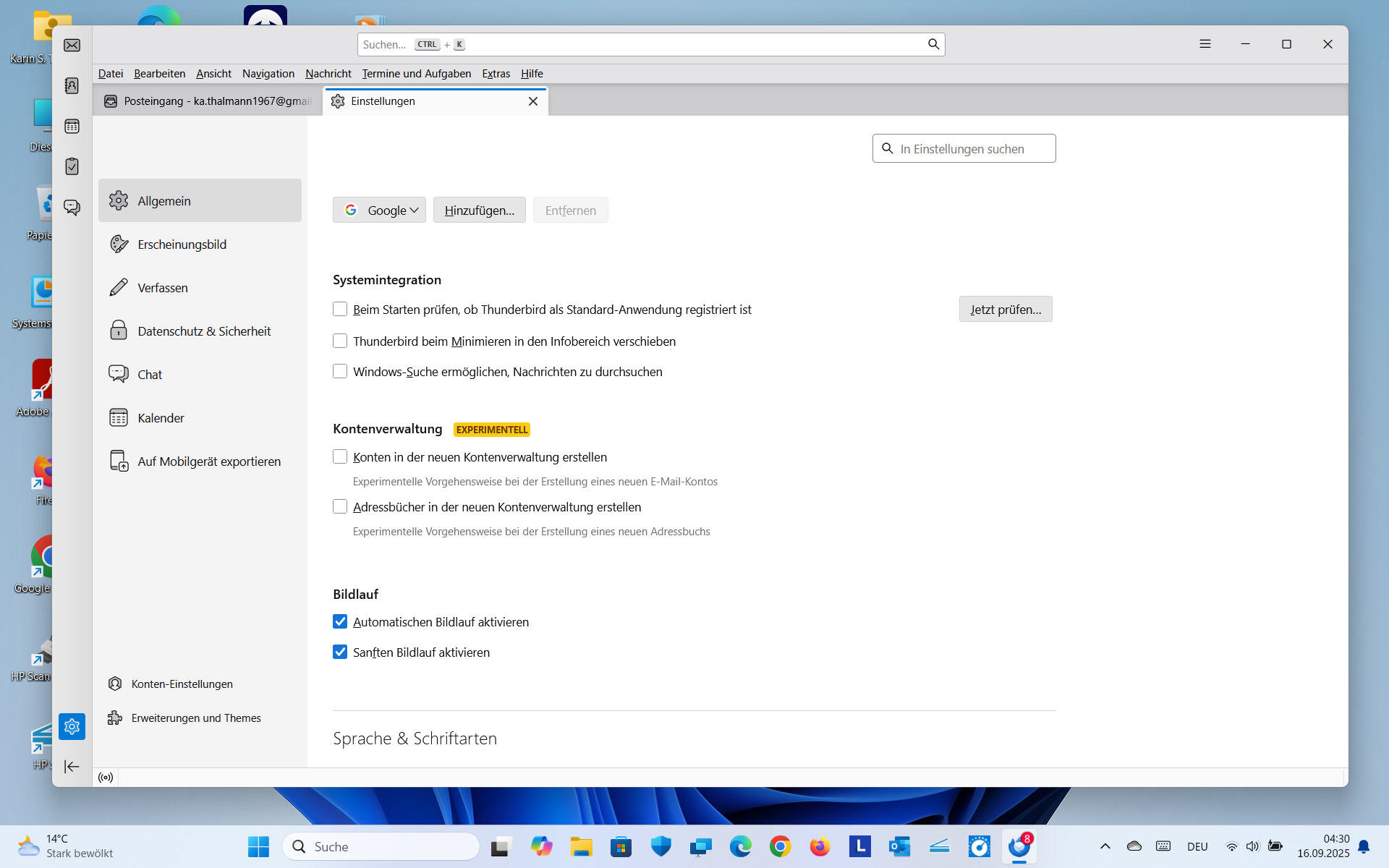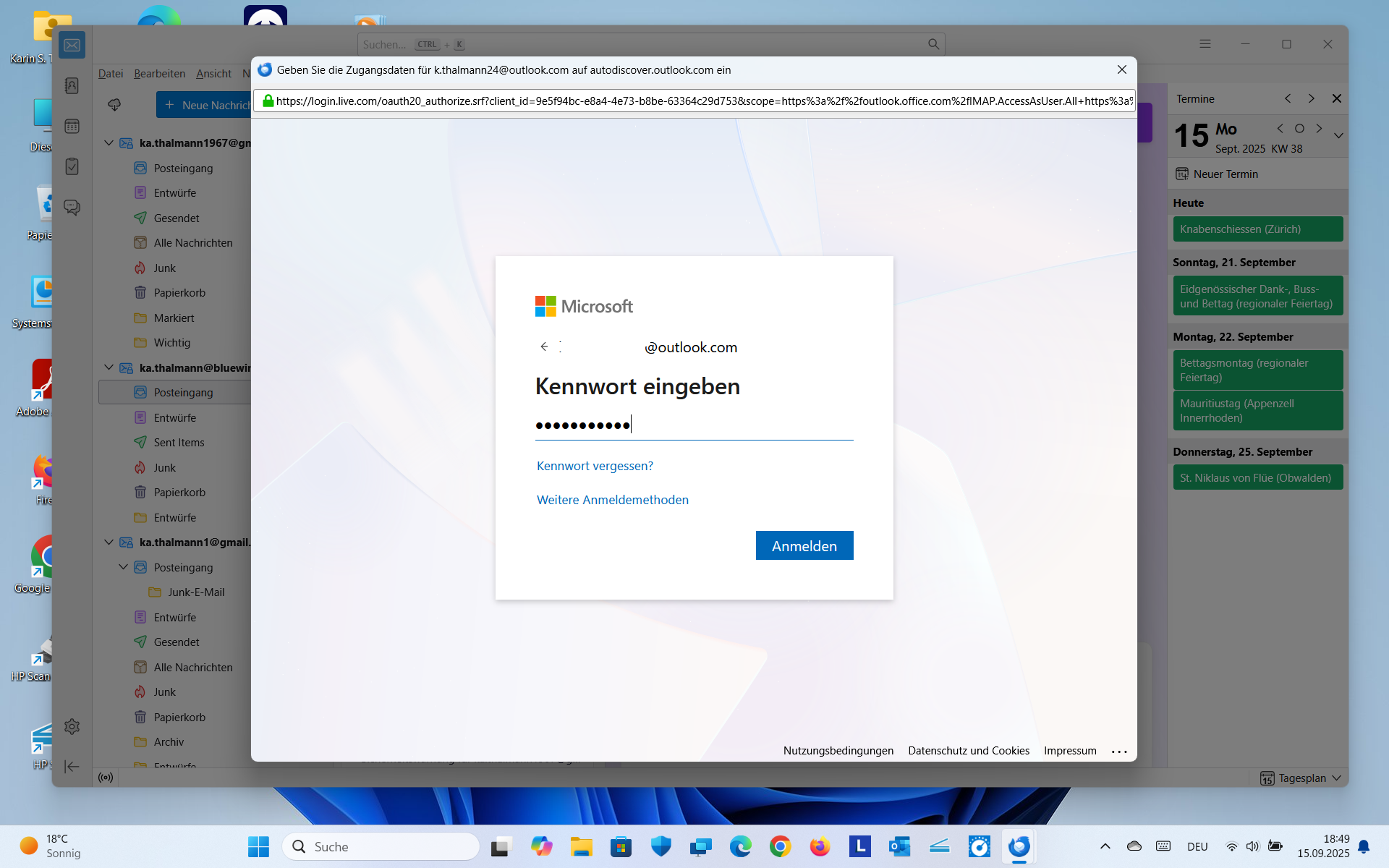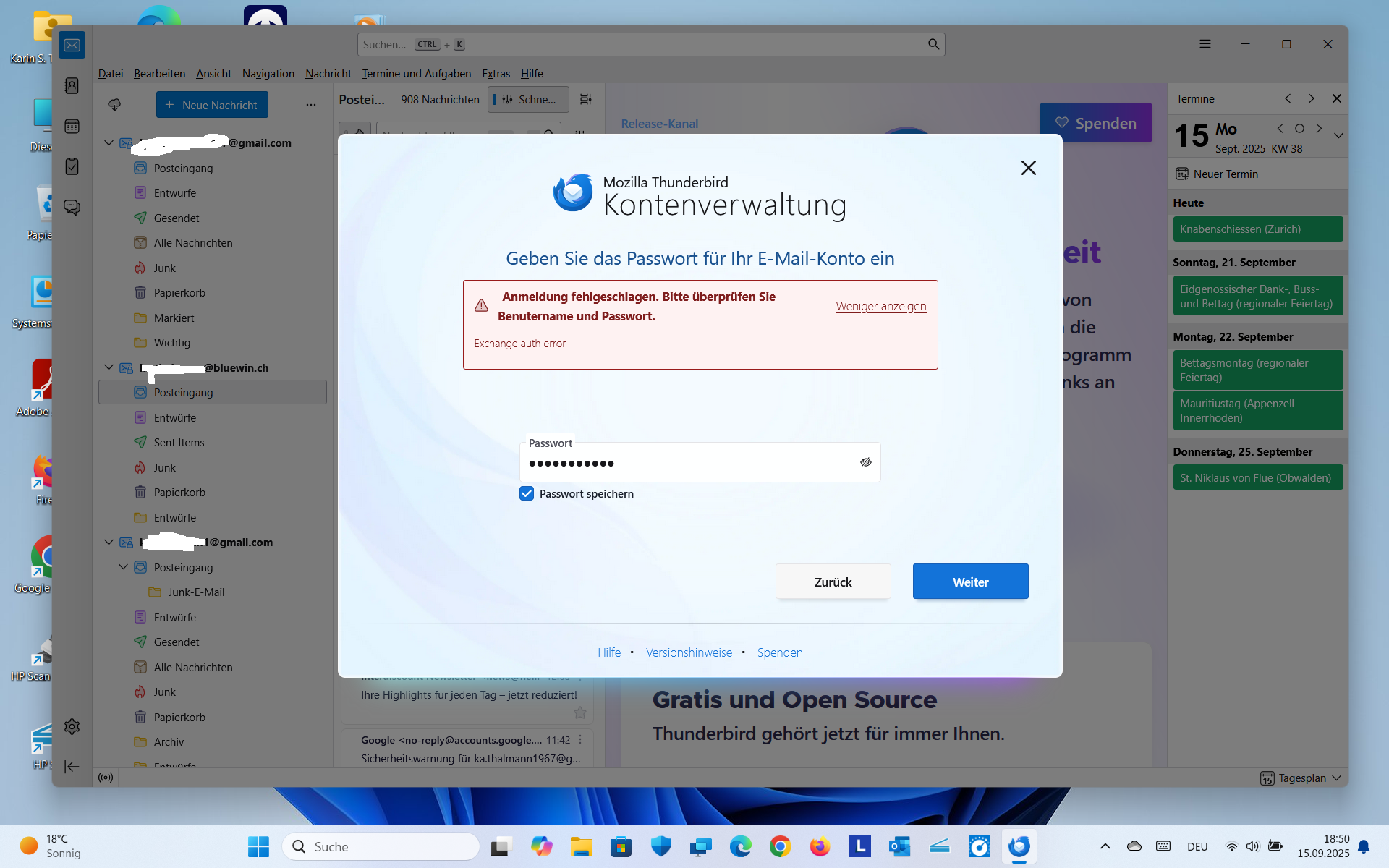 Seither versuche ich vergebens, mein Microsoftkonto ...outlook.com wieder in Thunderbird einzufügen. Wenn ich das Konto zu erstellen versuche und vorher die gespeicherten Zugangsdaten für mein outlook.com-Konto und die Chronik in Thunderbird lösche, öffnet es mir zwar das Anmeldefenster von Micorosft. Aber immer wenn ich dort meine Zugansdaten eingebe, egal ob mit Passwort, Pin oder via Microsoft Autehntifizierungsapp auf dem Handy verlangt dann Thunderbird nochmals mein outlook.com Passwort und dann bricht die Anmeldung mit einem Authentifizierungsfehler ab, siehe Anhänge. Den Fehler habe ich erst seit der neusten Programmversion 142.0. Zeitweilig öffnet es nicht einmal mehr das Microsoft-Anmeldefenster sondern nur noch ein Anmeldefenster von Thunderbird direkt. Bei IMAP und POPUP sind in outlook.com unter Weiterleitung und IMAP Geräten und Apps die Verwendung von POPUP und IMAP gestattet drin, siehe Anhang.