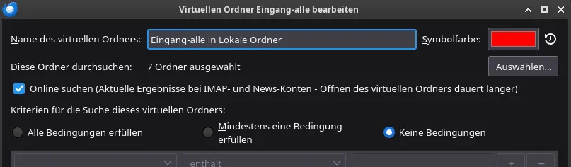 Ich habe versuchsweise in den Eigenschaften des virtuellen Ordners einen Zielordner aus der Liste der beobachteten Ordner entfernt, doch nach Aktualisieren und Wiederaufnahme in die Liste treten die Probleme auch mit diesem Zielordner weiterhin auf. Ich habe eine Erweiterung (ImportExportTools NG), die ungefähr zur fraglichen Zeit automatisch aktualisiert wurde, deaktivert - ohne Erfolg. Der letzte Upgrade von Thunderbird fand deutlich vor dem ersten (beobachteten) Auftreten der Probleme auf - vermutlich auch nicht die Fehlerursache. Abstürze des Programms oder des Rechners hat es im fraglichen Zeitraum auch nicht gegeben.