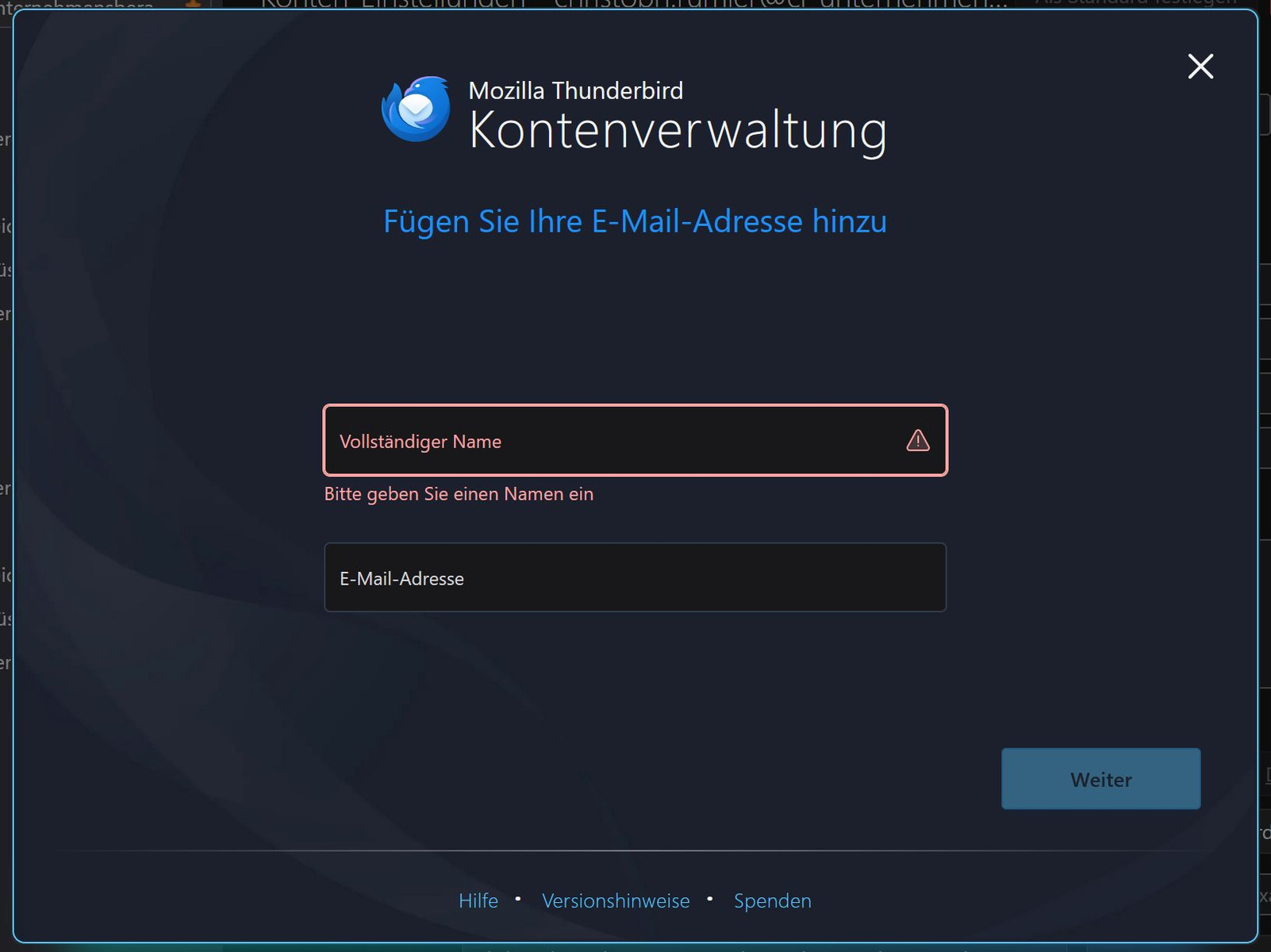 Bin am Einrichten eines neuen SAMSUNG GALAXY Book5 360 PRO. Die herunter geladene Thunderbirdversion ist 143.0. (Ist noch nicht im ReleaseChannel auswählbar, meine Auswahl 140.ESR ist daher falsch).Habe zwei E-Mail-Konten erfolgreich angelegt (IMAP, 1und1, Norton 360). Thunderbird bot eine Suchhilfe nach aktuellen E-Mail-Adressen an. Sie wurden korrekt gefunden. Auf dem Eingabefeld war da noch der Button "manuelle Einrichtung" enthalten. Beim dritten Konto wird nur noch Name und E-Mail angeboten, keine Auswahl mehr für manuelle Einrichtung. Drückt man auf "weiter" läuft eine endlose Suche. Habe nach einer Stunde über den Taskmanager abgebrochen, anders kann man den Prozwess nicht stoppen. Im Taskmanager stehen unter Thunderbird 5 Prozesseinträge: crashhelper, Einstellungen und 3x Thunderbird ohne ergänzende Bezeichnungen. Startet man Thunderbird neu oder startet man den Rechner neu, werden zur Kontenverwaltung/Konto einrichten nur die drei Eingaben Name, E-Mail und Weiter angeboten (Bild ist angehäng). Was wieder zur endlosen Suche führt. Kann ich die manuelle Einrichtung auf einem anderen Weg auslösen?