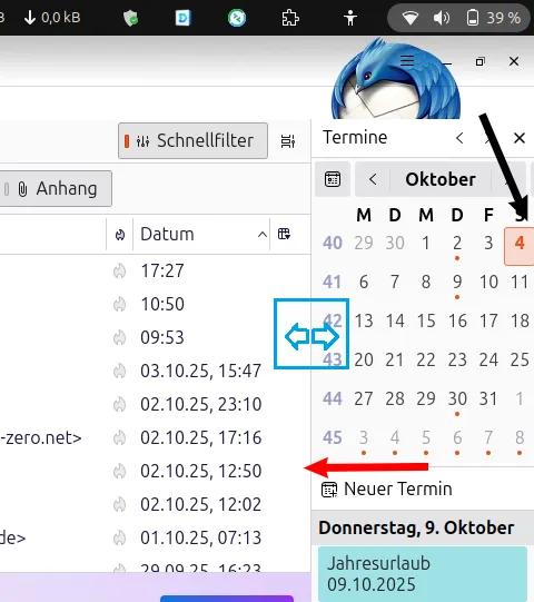 Man sieht oben rechts einen Fitzel vom Jahr. Ungewöhnlich ist schon, dass bei der gezeigten Breite nicht der komplette Inhalt dargestellt wird. Es mag an Ubuntu 24.04.2 LTS liegen. Jedenfalls verschluckt der Tagesplan Inhalte, wenn die Spalte vermeintlich zu schmal ist.