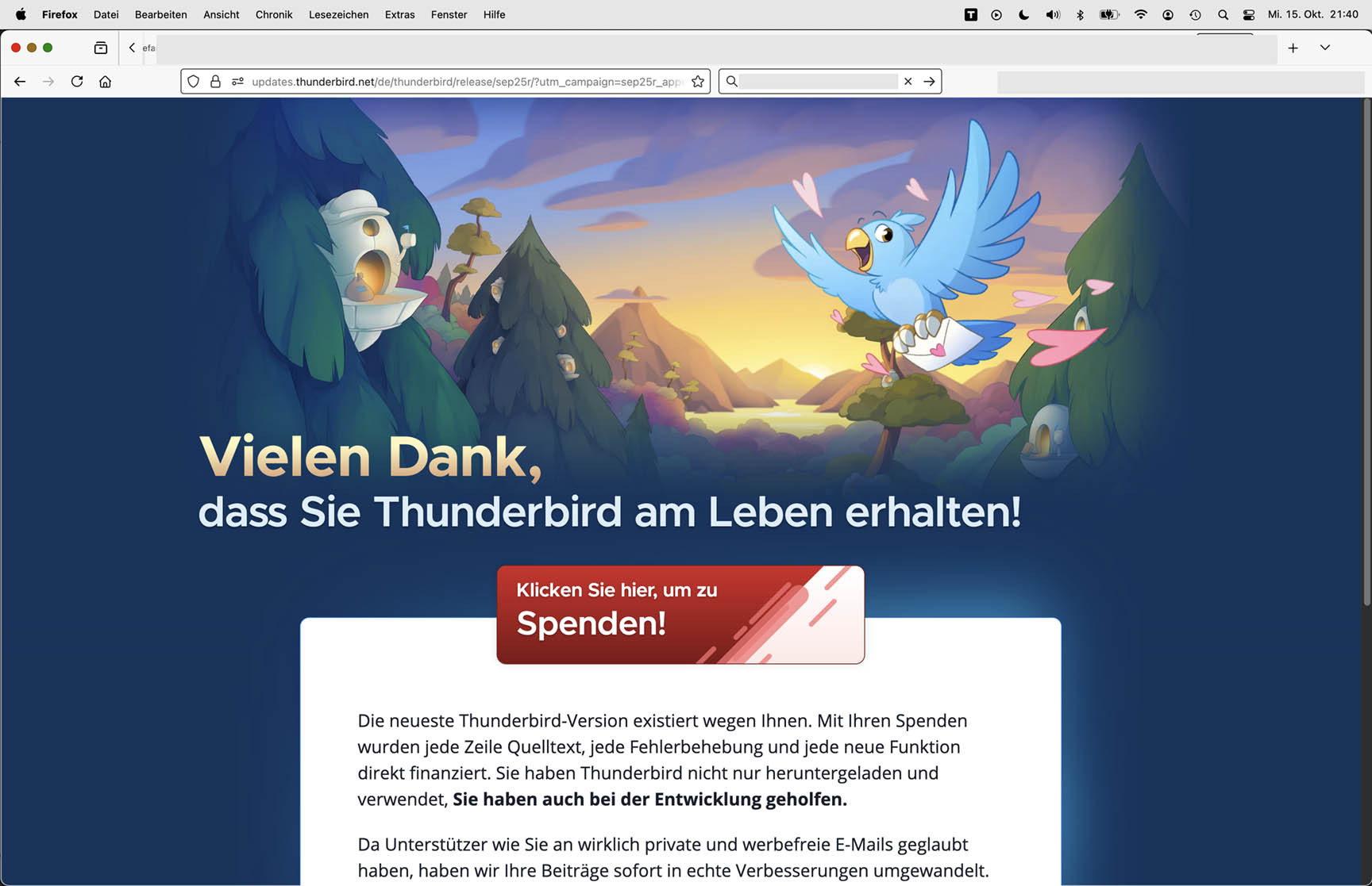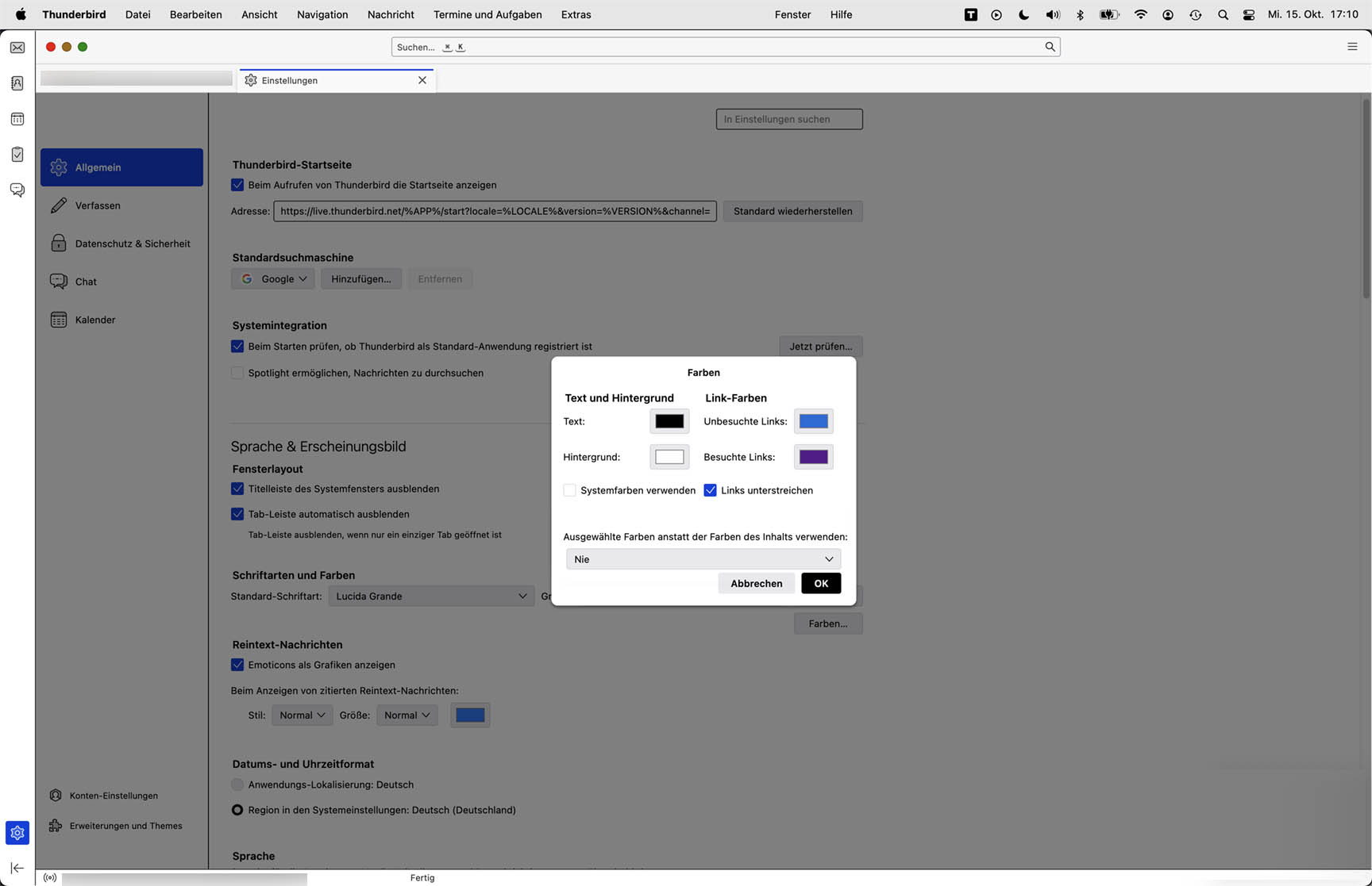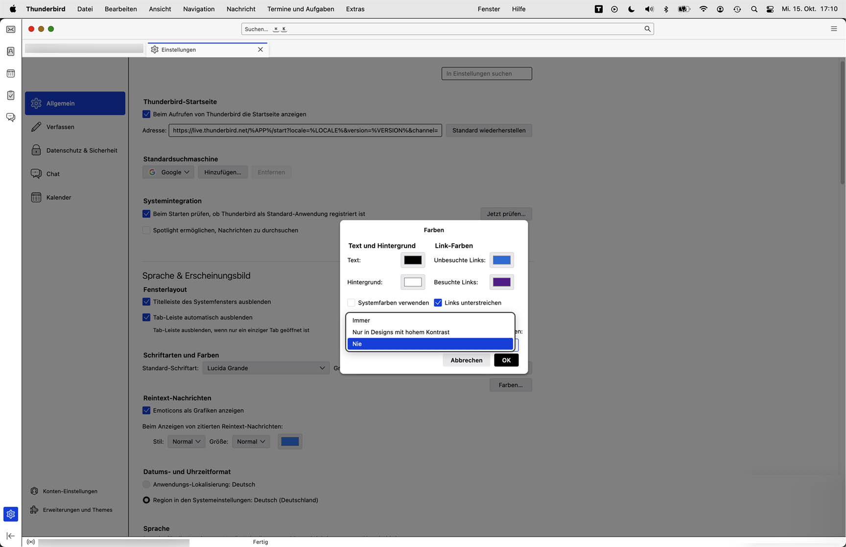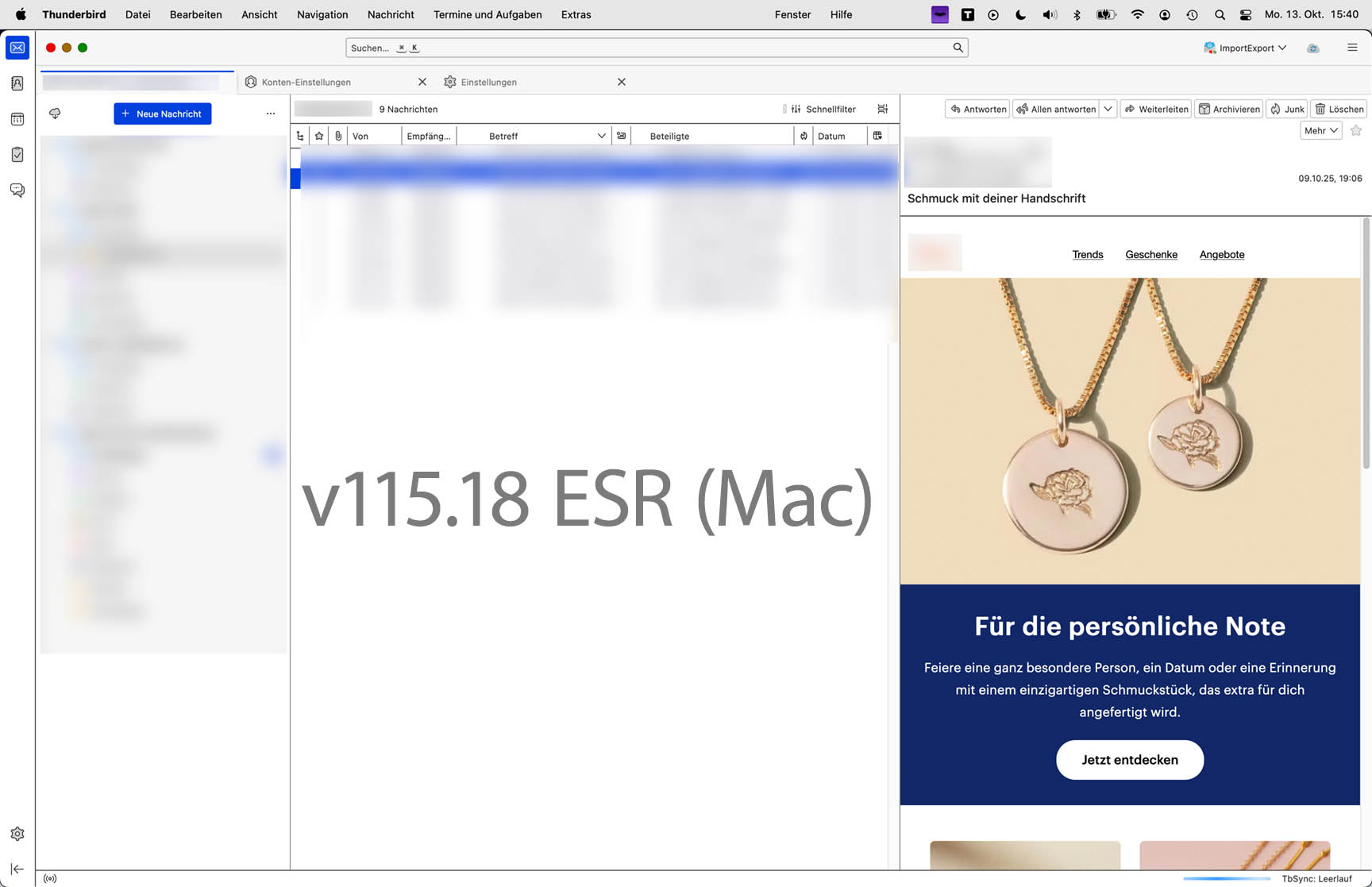 Ich hatte zunächst die aktuellste Version 143.0.1 installiert und da war mir aufgefallen, dass die Inhalte von HTML/CSS-formatierten Mails (Newsletter und dergleichen) anders dargestellt werden, als ich es gewohnt war. Dies äußert sich am auffälligsten in der falschen Schriftfarbe (Headlines häufig in blau statt schwarz) und dass Hintergrundfarben oder Hintergrundbilder generell nicht dargestellt werden. Habe dann etwas rumprobiert und rausgefunden, dass die Version 115.18.0 noch alles perfekt und wie gewohnt darstellt und das Problem erst mit den neueren Versionen auftritt. Ab Version 140 esr bzw. 143 kommt noch hinzu, dass die Hintergrundfarbe bei CSS-formatierten Mails hellgrau statt weiss dargestellt wird. Deinstallation (mit Uninstaller) und Neuinstallation behebt das Problem leider nicht.