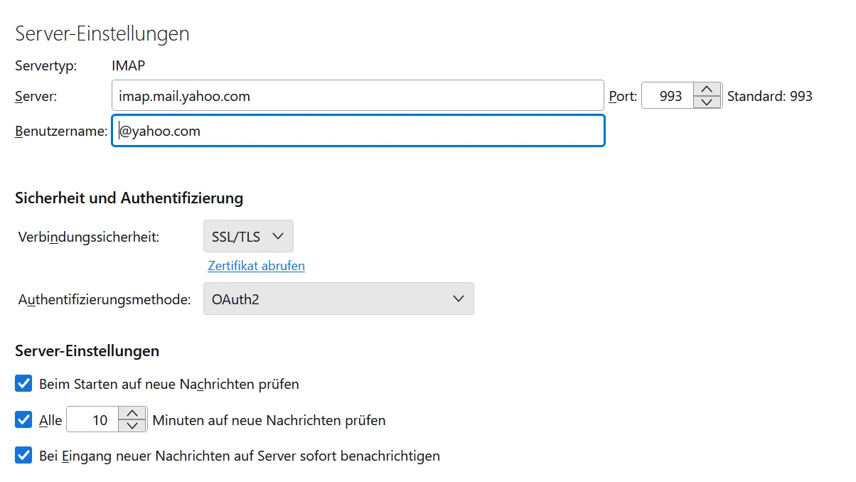 Ist bei "YAHOO" für dich unter Authentifizierungsmethode "OAuth2" überhaupt notwendig? Eigentlich reicht bei "YAHOO" ==> "Passwort normal", es sei denn, du bist explizit für die "2-Wege-Authentifizierung" bei jenem Anbieter angemeldet.